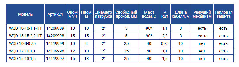Высокотемпературные насосы Wellmix серии WQD представляют собой погружные канализационные насосы с поплавковым выключателем, предназначенные для работы с жидкостями, температура которых достигает 90°C. Допускается кратковременная работа с температурой до 100°С (не более 5 минут).