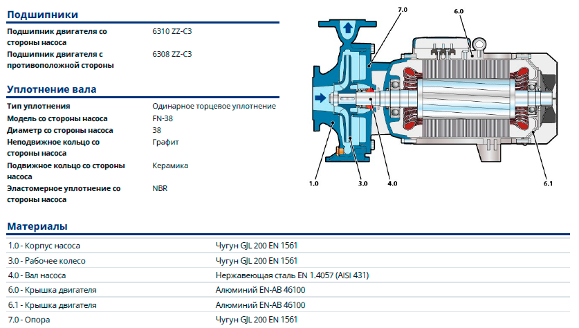 Это одноступенчатые центробежные насосы с односторонним всасыванием и фланцевые патрубки. Они спроектированы в соответствии с европейским стандартом EN 733 и разработаны таким образом, чтобы их можно было обслуживать без отсоединения труб.