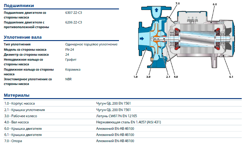 Это одноступенчатые центробежные насосы с односторонним всасыванием и фланцевые патрубки. Они спроектированы в соответствии с европейским стандартом EN 733 и разработаны таким образом, чтобы их можно было обслуживать без отсоединения труб.
