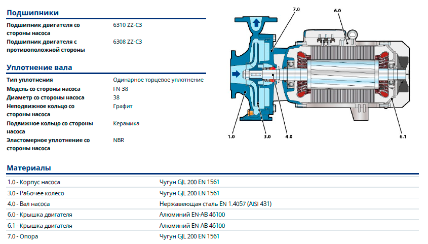 Это одноступенчатые центробежные насосы с односторонним всасыванием и фланцевые патрубки. Они спроектированы в соответствии с европейским стандартом EN 733 и разработаны таким образом, чтобы их можно было обслуживать без отсоединения труб.