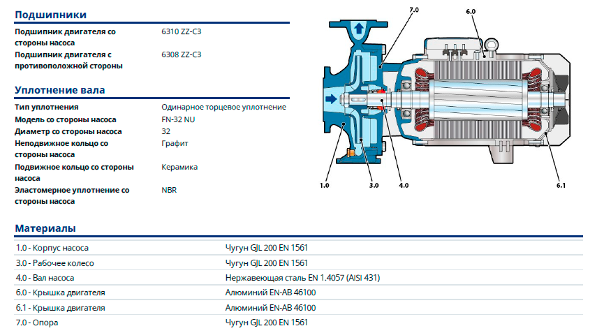 Это одноступенчатые центробежные насосы с односторонним всасыванием и фланцевые патрубки. Они спроектированы в соответствии с европейским стандартом EN 733 и разработаны таким образом, чтобы их можно было обслуживать без отсоединения труб.