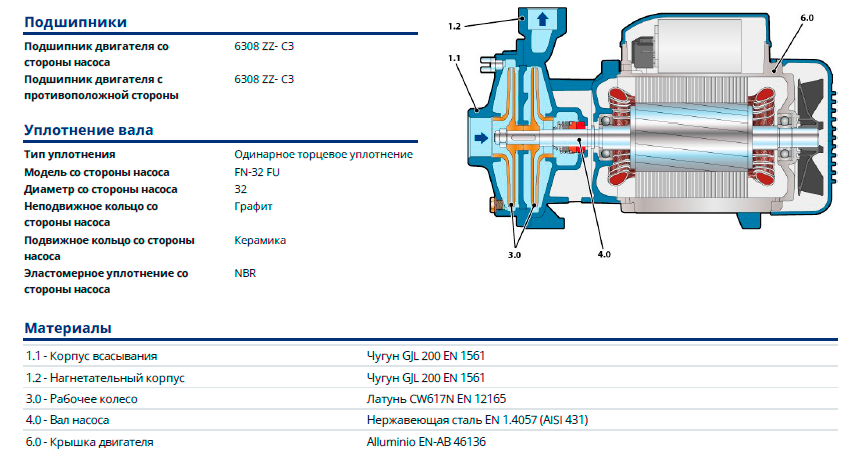 - Максимальное давление в корпусе насоса: 10 бар; 6 Бар для 2CP25/130N.