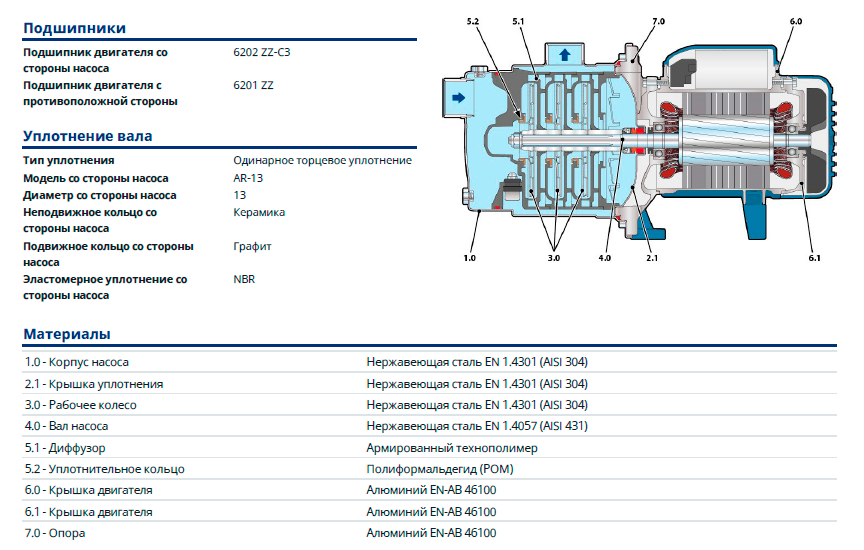 - Максимальное давление в корпусе насоса: 6 бар.