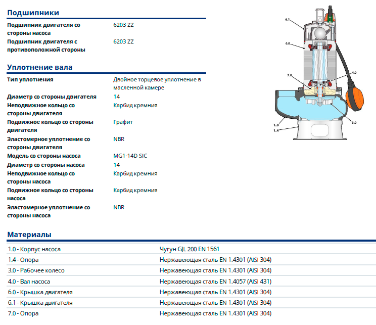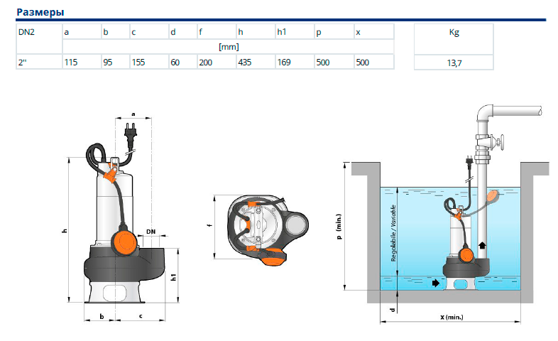 - Прохождение твердых частиц во взвешенном состоянии: – до Ø40 мм для VX/35; – до Ø50 мм для VX/50.