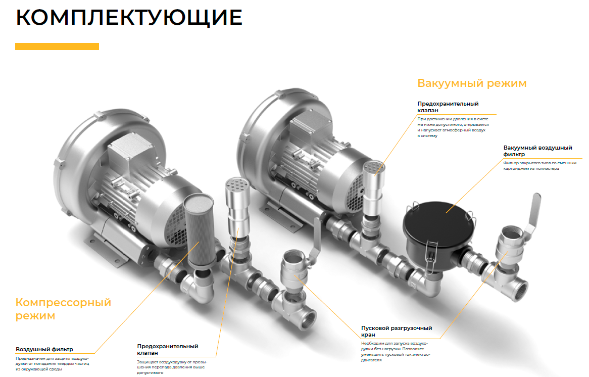 Воздуходувки можно монтировать как горизонтально, так и вертикально, что позволяет максимально эффективно использовать пространство. А дополнительная опция со встроенными в глушитель предохранительным клапаном и вакуумметром значительно сокращает и упрощает обвязку.